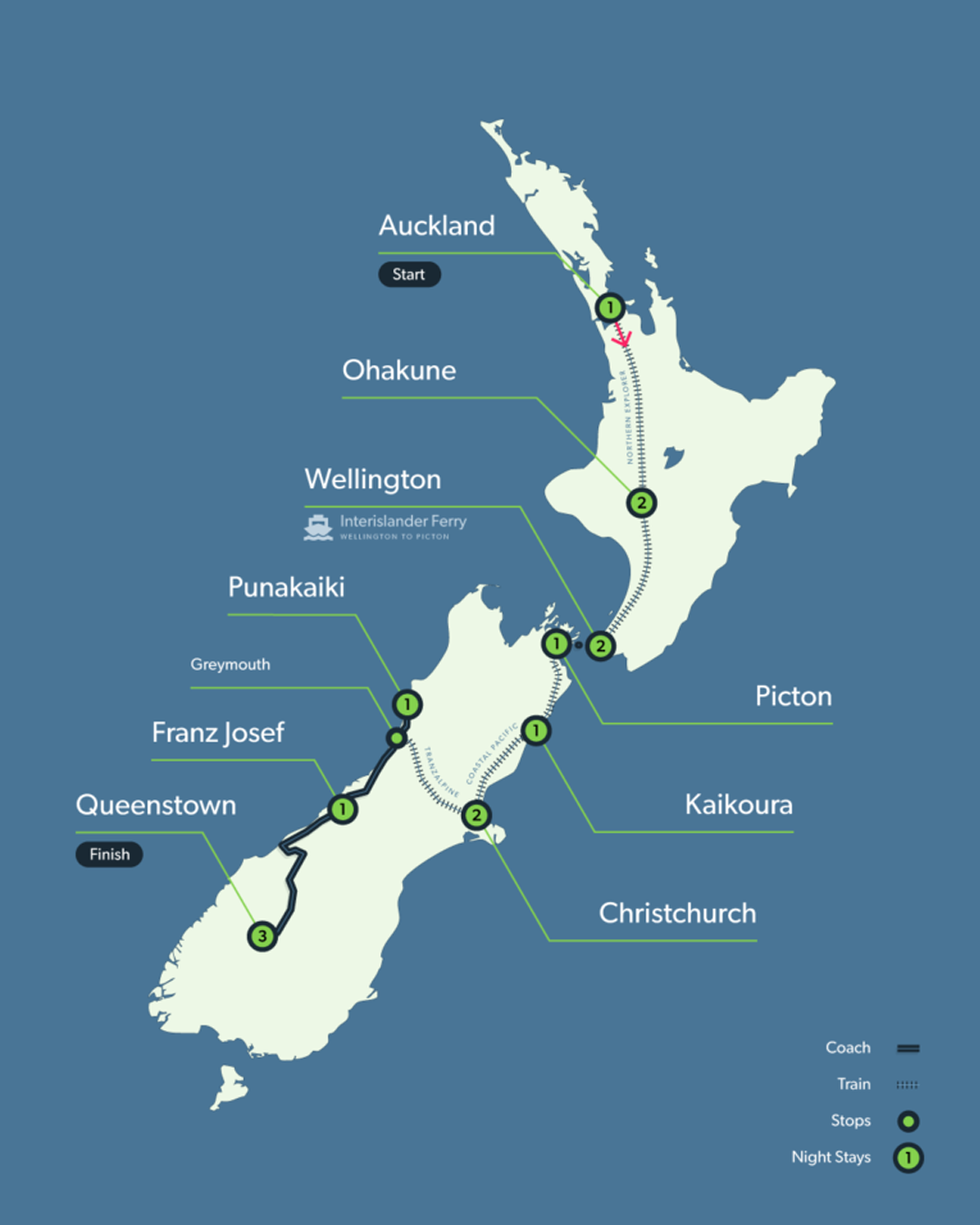 | Destinations | Auckland, Christchurch, Kaikoura, Marlborough, Punakaiki, Queenstown, Volcanic Plateau, Wellington, West Coast |