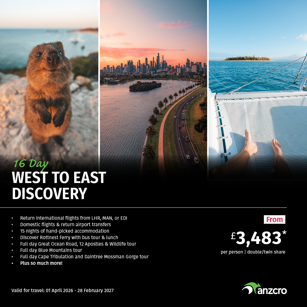 Experience the best of Australia with this 16 Day West to East Discovery. Immerse yourself in the awe-inspiring beauty of Perth & Rottnest Island before heading east to embark on a breathtaking Great Ocean Road journey. Head north to Sydney and delight in the city and Blue Mountains, before continuing north to experience the picturesque Cairns & Great Barrier Reef.